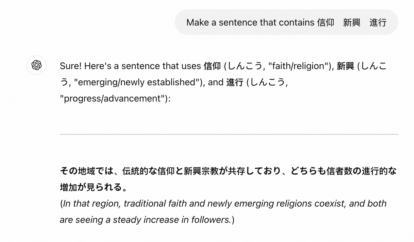 Another example: I asked ChatGPT to “Make a sentence that contains 信仰, 新興, and 進行”, three words with the exact same pronunciation but very different meanings.