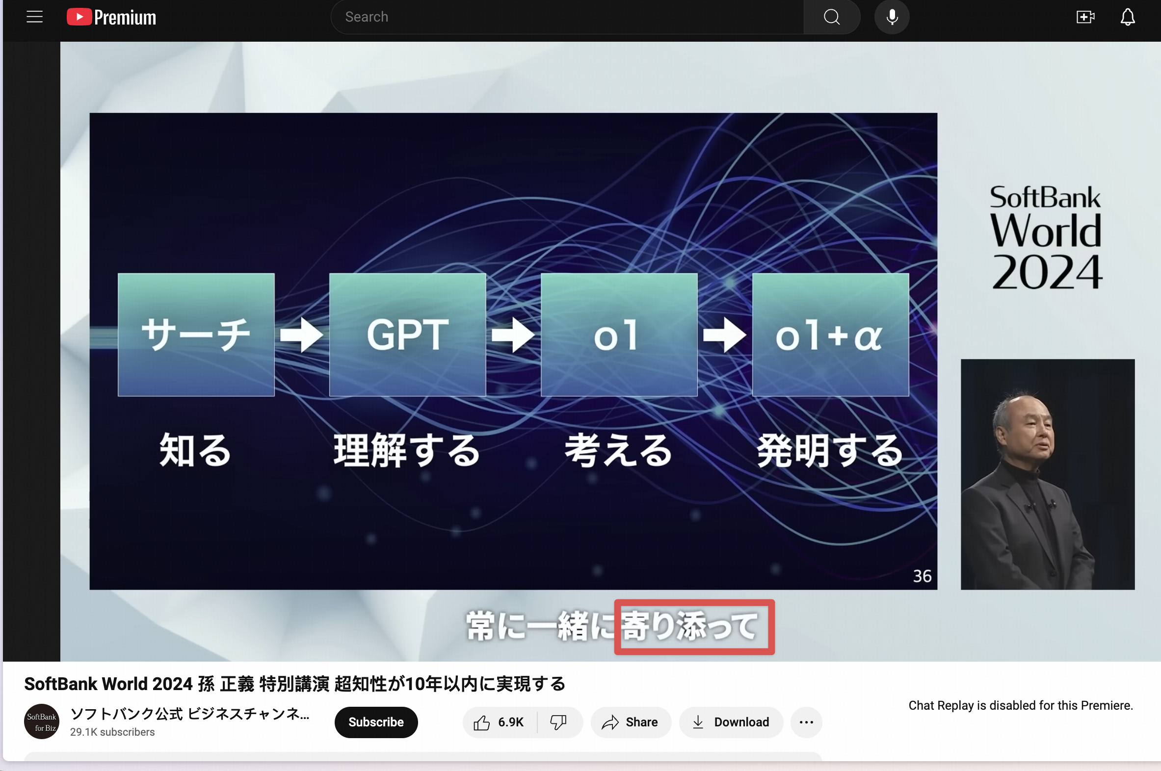 Until one day I was watching a Japanese YouTube video where Masayoshi Son was giving his annual SoftBank World keynote address. He was discussing the future of AI, and used the phrase “常に寄り添って” when talking about how personal AI agents will “always be by your side”.