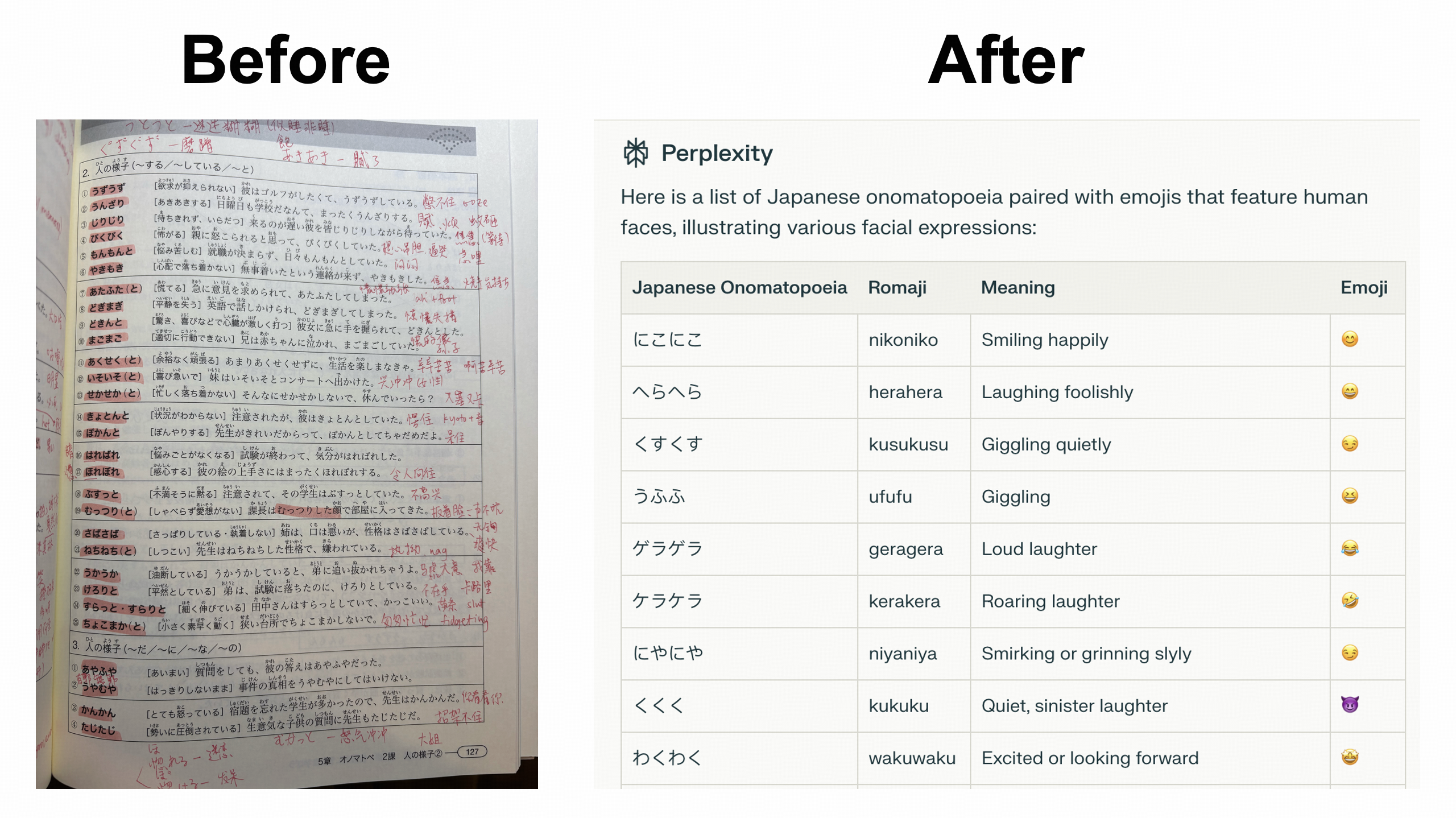 For example, I asked Perplexity to “Create a list of 100 Japanese onomatopoeia and match them with emojis that can illustrate their meanings.” The resulting list was fantastic. It turns something abstract into something concrete. It’s 10 times more memorable and fun than staring at a boring textbook.